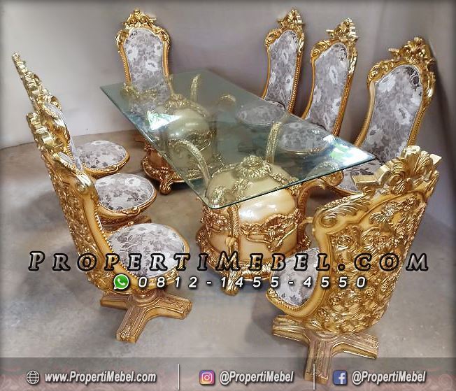 Produk furniture klasik dibuat dari bahan baku berkualitas dengan detail ukiran yang lebih rapi serta bentuk model yang cukup rumit sehingga hanya diminati dan mampu dimiliki oleh kalangan atas saja. Jika anda tertarik dengan kursi makan mewah warna emas model terbaru ini silahkan hubungi CS Properti Mebel Jepara kami melalui Whatsapp dengan mengirim kembali contoh gambar foto Kursi Makan Mewah Ukir Klasik Model Eropa
