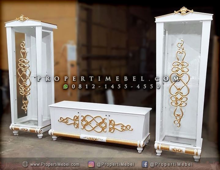 Model Meja TV Minimalis Putih Classic Modern kali ini dibuat dengan model terpisah antara meja pendek dengan lemari pintu kaca dengan jumlah 2 unit di sisi samping kanan dan kiri. Hiasan ukiran pada meja dan lemari kaca tersebut tidaklah banyak karena mengutamakan konsep minimalis dengan paduan classic. Hiasan ukiran yang paling mencolok pada meja dan lemari pintu kaca tersebut yaiutu adanya ukiran tempel dengan pola yang cantik. Untuk lebih jelasnya dapat anda simak contoh gambar foto dan deskripsi singkat produk di bawah ini :