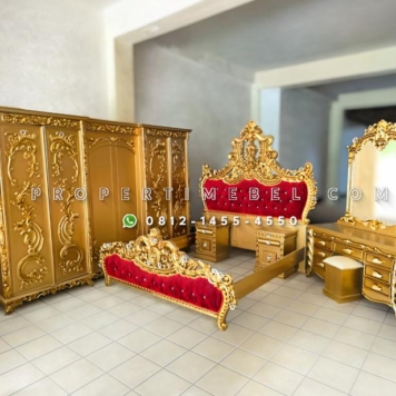 Set kamar tidur ukir mewah warna emas dari bahan kayu jati ini bisa menjadi pilihan anda bagi yang menyukai produk perabotan kamar yang terkesan klasik ala Eropa. Set kamar tidur mewah warna emas atau gold ini biasanya hanya dipesan oleh kalangan tertentu saja yang artinya model tersebut cukup jarang ada yang menyamai. Furniture set kamar tidur ini terdiri dari tempat tidur, lemari pakaian, meja rias dan 2 unit nakas meja kecil. Klengkapan kamar set tersebut tidak harus anda pesan semua dna bisa menyesuaikan kebutuhan maupun ukuran luas kamar tidur. Begitu pula dengan warna finishing yang bisa anda request selain warna emas seperti warna natural coklat maupun cat duco ataupun yang lain sesuai keinginan anda.